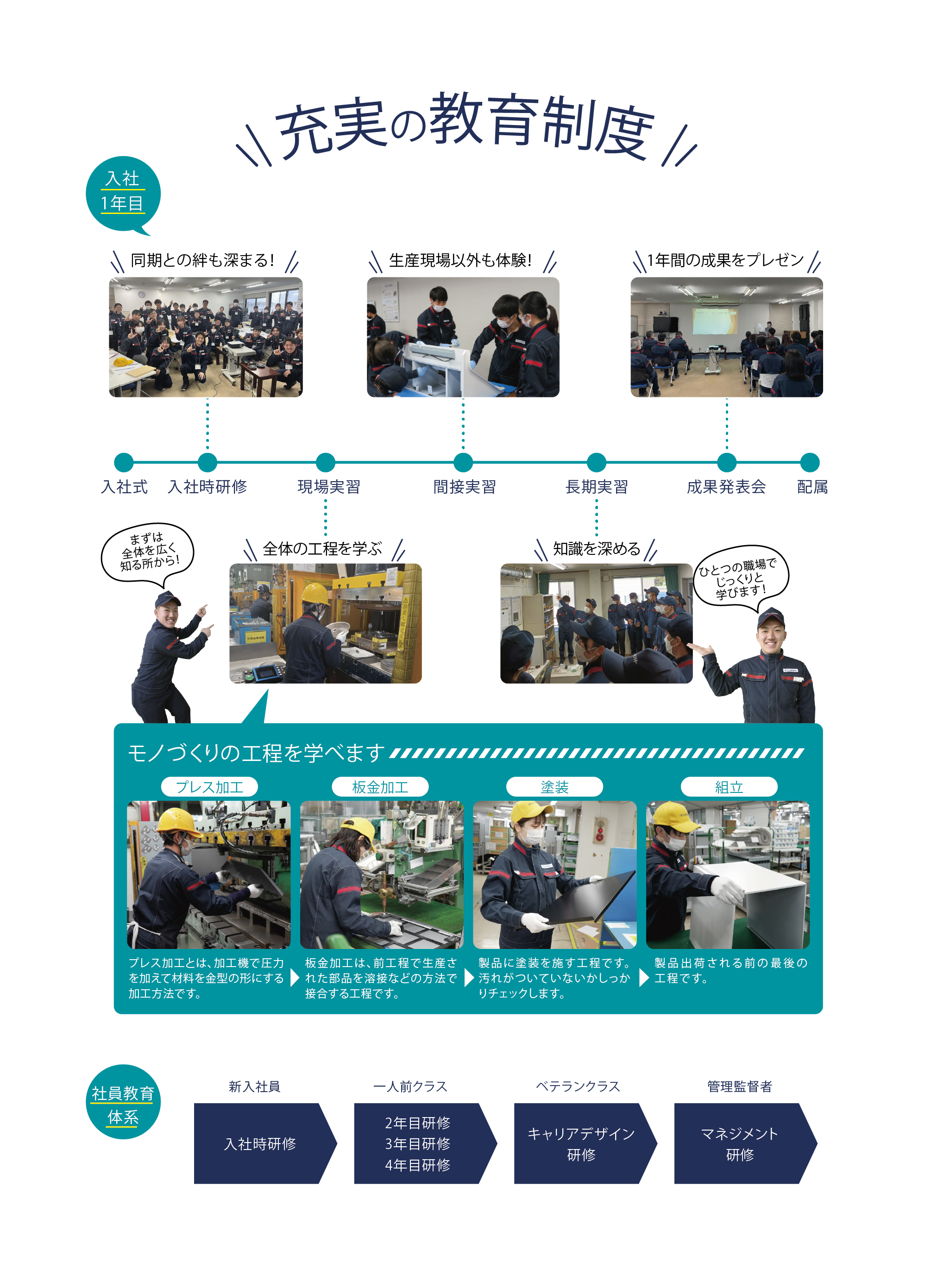 ものづくりの基本や社内のつながりを体得するため、新入社員は1年間の生産現場実習を経験します。実習期間中は製品の生産に直接関わることができ、「仕事」と「人」を知る貴重な機会となります。また並行して初年度研修や管理間接部門を体験する実習も年間を通して実施し、「経験」を重視したプログラムになっています。