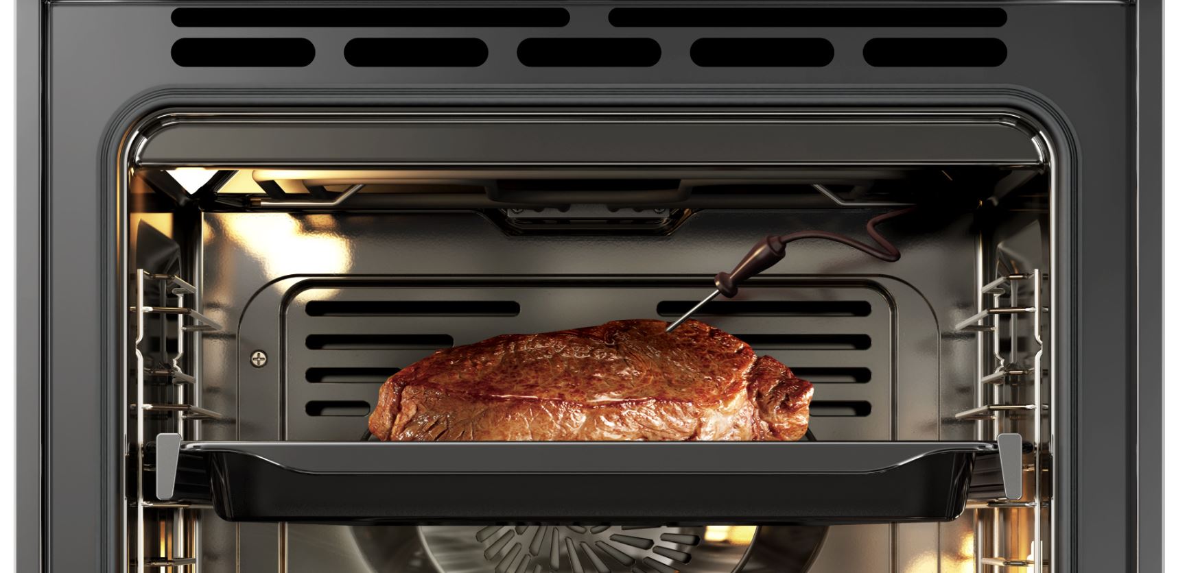 Equipped with meat probe for easy check of cooked meat, with 3 accessories - wire rack, enamel baking tray and deep enamel baking tray for various uses