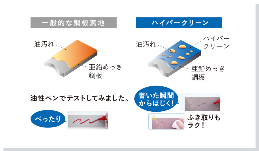 油汚れを弾き、浮かせた状態でのふき取りを可能にします。従来の一般的な材質に比べ、お手入れにかかる手間と時間を軽減します。
