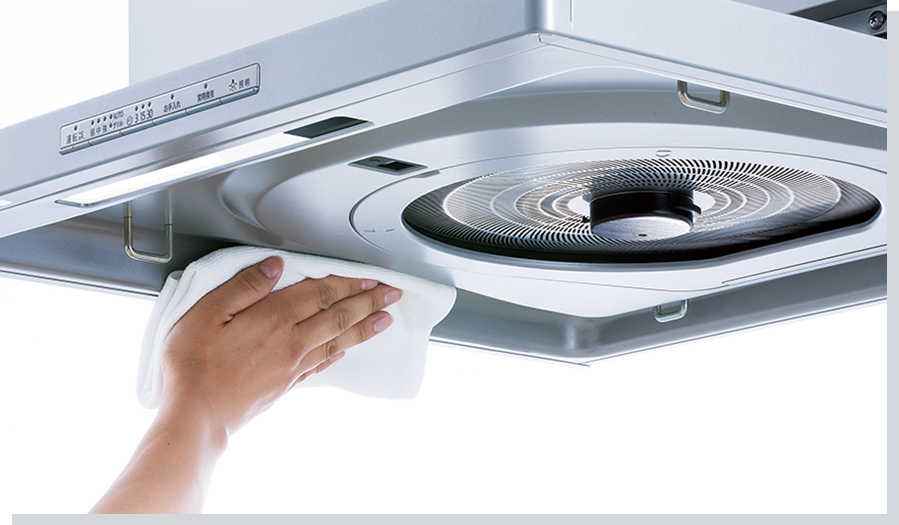 油を瞬間的に弾く、表面処理。ファン部分に採用することで、付着した油を遠心力で分離し、オイルトレーに滴下させます。油汚れを考慮して限られたパーツに採用しています。