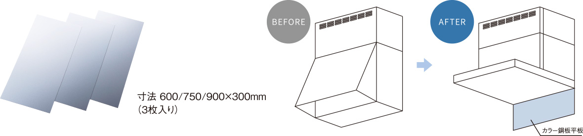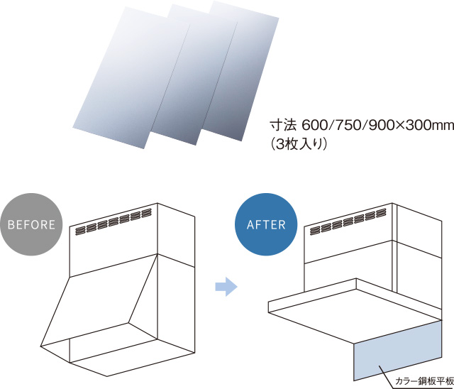 本体同色のカラー鋼板です。既設取付面が露出し、意匠合わせが必要な際に使用します。