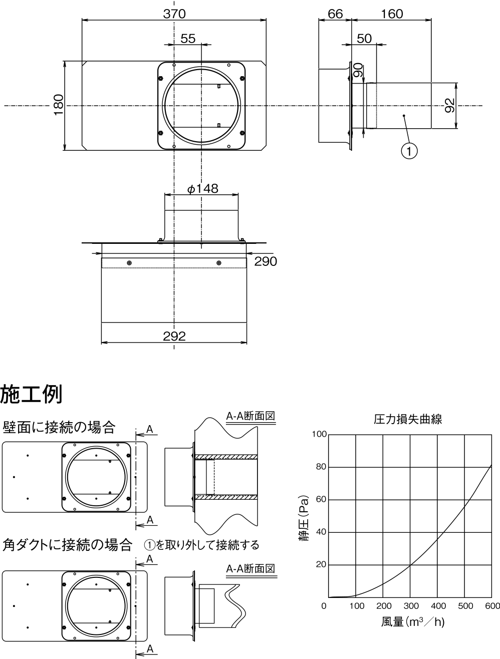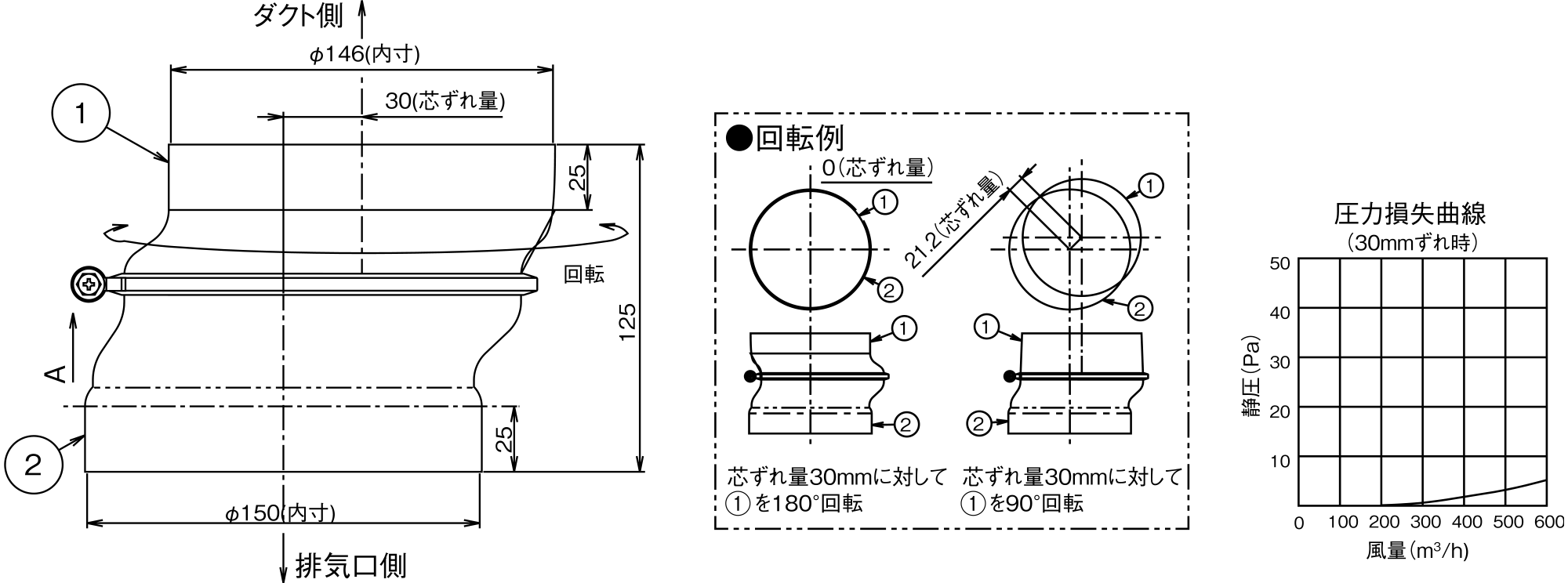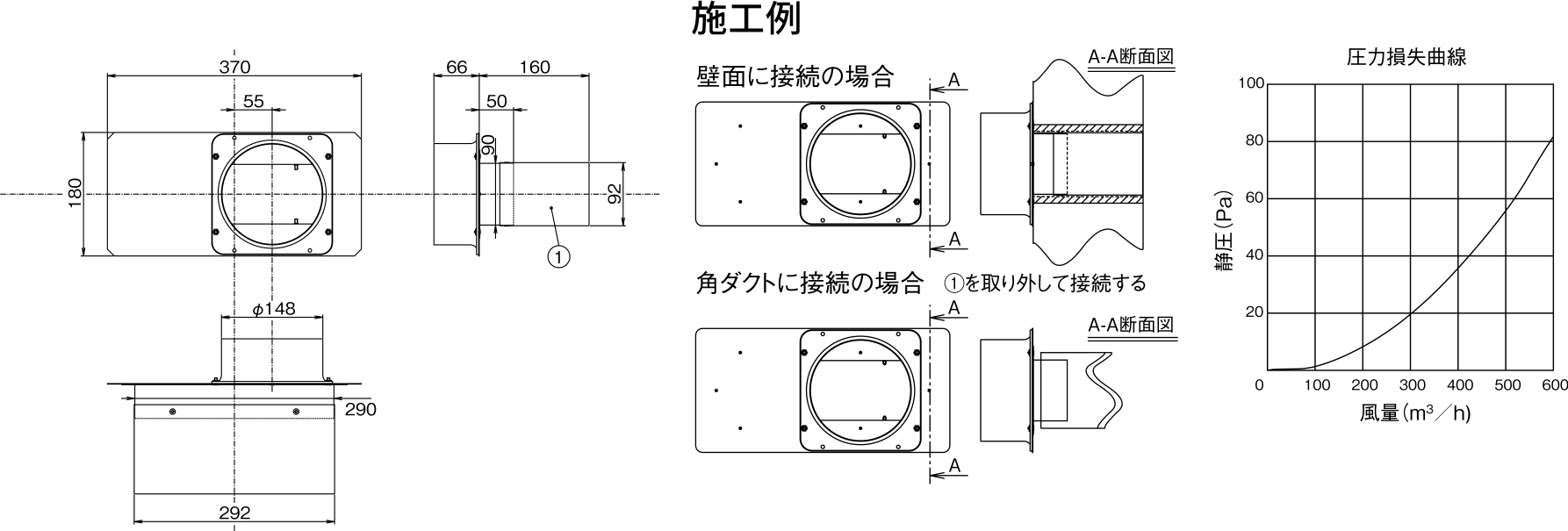 角ダクトからφ150ダクトに変換して工事をする場合に使用します。