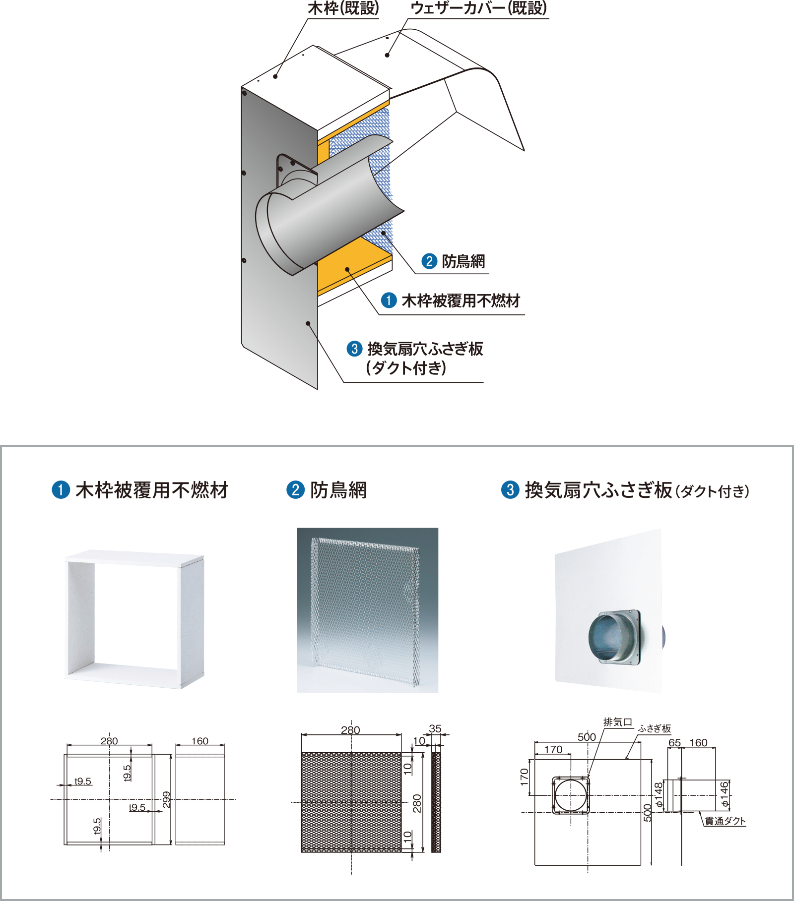 | 木枠被覆用不燃材・防鳥網セット PTK-KA(➊+➋) | ¥10,230(税抜価格 ¥9,300) |