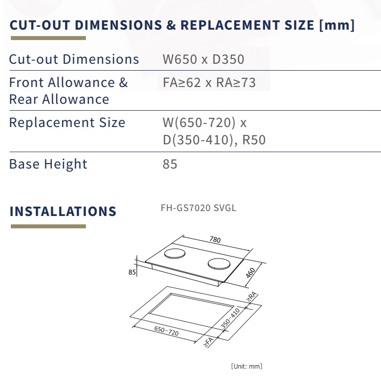 CUT-OUT DIMENSIONS & REPLACEMENT SIZE [mm] |