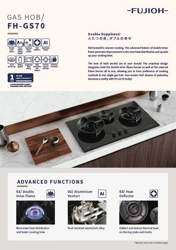 The best of both words are in your hands! The seamless design integrates both the double inner flame burner as well as the external flame burner all in one, allowing you to have preference of cooking methods in one single gas hob. Your master chef dreams of yesterday becomes a reality with FH-GS70 today!