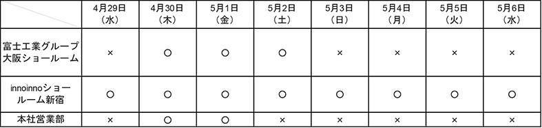 誠に勝手ながら、ゴールデンウィーク中(2015年4月29日~5月6日)の営業日ならびにお休みは、以下の通りとなっております。お客様にはご不便をおかけいたしますが、何卒ご容赦賜りますようお願い申し上げます。