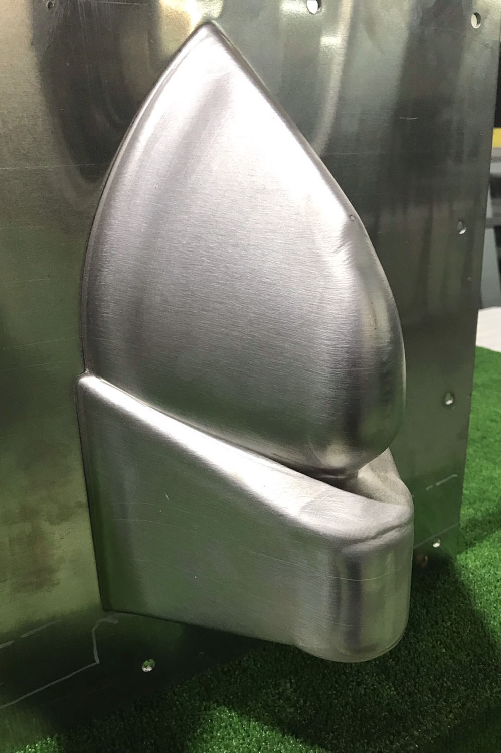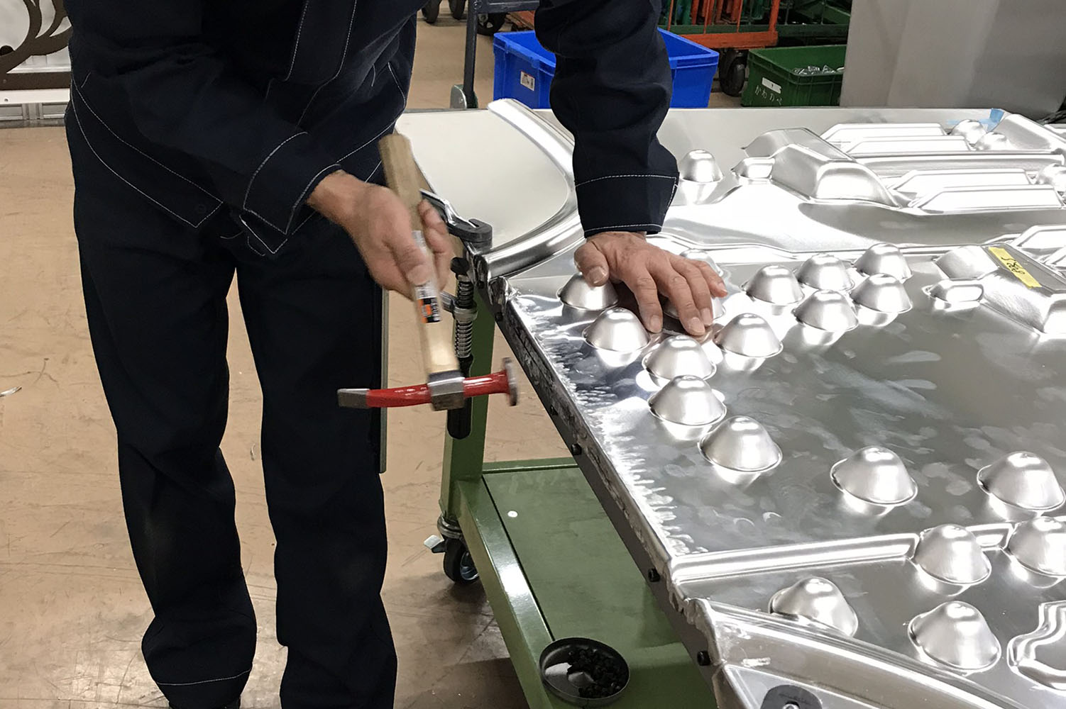 2020年3月、レリーフを構成するパネルの製作がスタートした。材料は厚さ2mmのアルミ板だ。逐次成形の後、四角形のパネル四辺は90度に曲げられ箱状に加工される。成形した部分はベンダーで曲げられないので、ハンマーによる手作業での仕上げだ。
