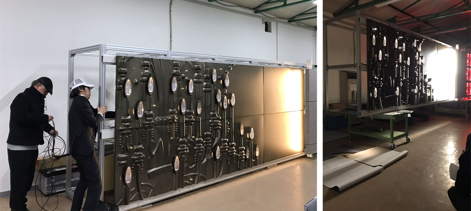 2019年12月、絞り深さ150mmのレリーフサンプルを手にゼネコン(鹿島建設様)を訪問した。その会議で、150mmでの実現が困難であること、もっと低い絞り深さでも十分な表現力を持たせることができることを認識いただき、翌2020年1月末に、部分的な実物大サンプルで、クライアントにより最終評価をする場を設定することになった。この日から約一か月後、年末年始があることを考えると、実質一か月もない状況であった。