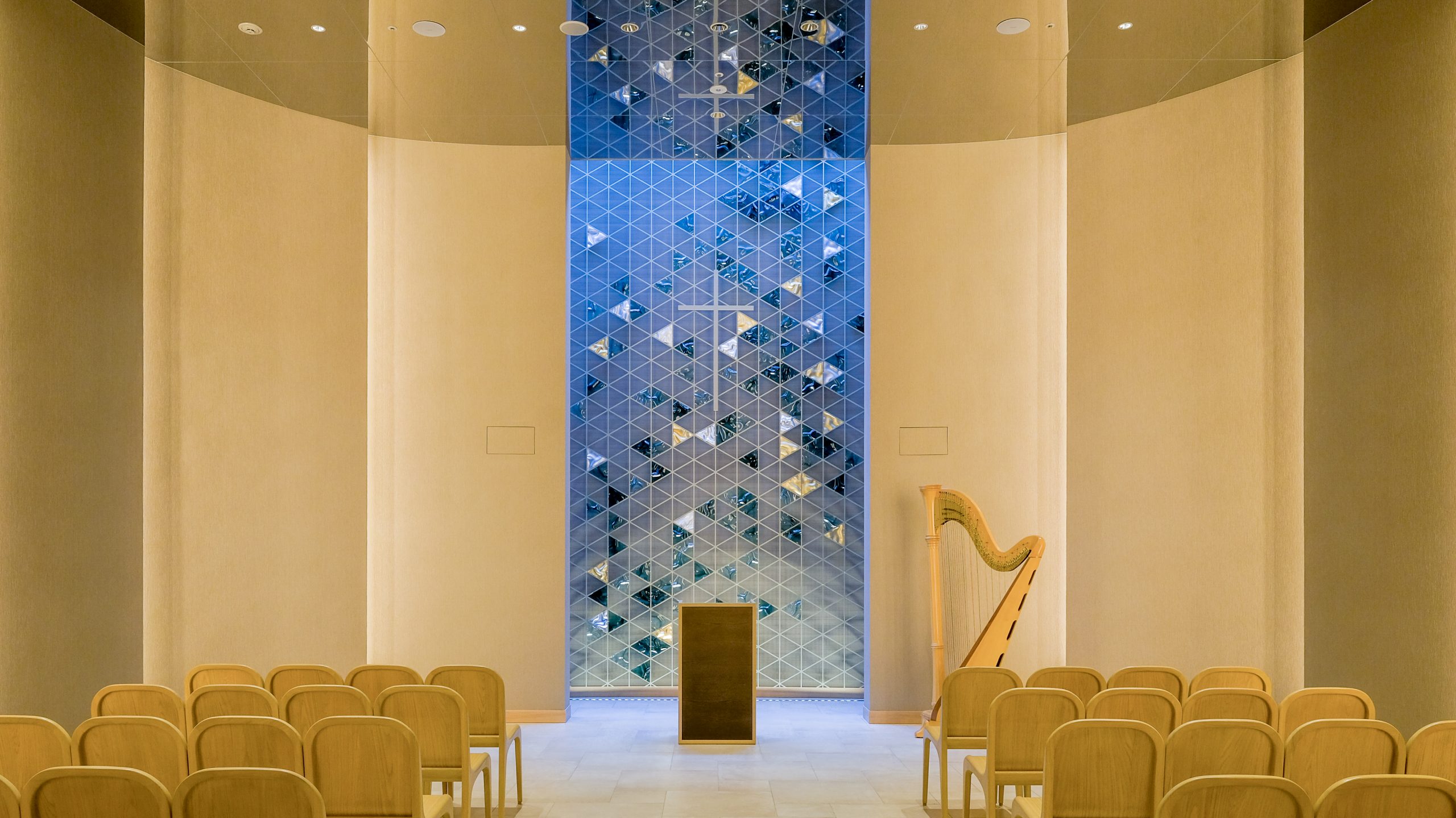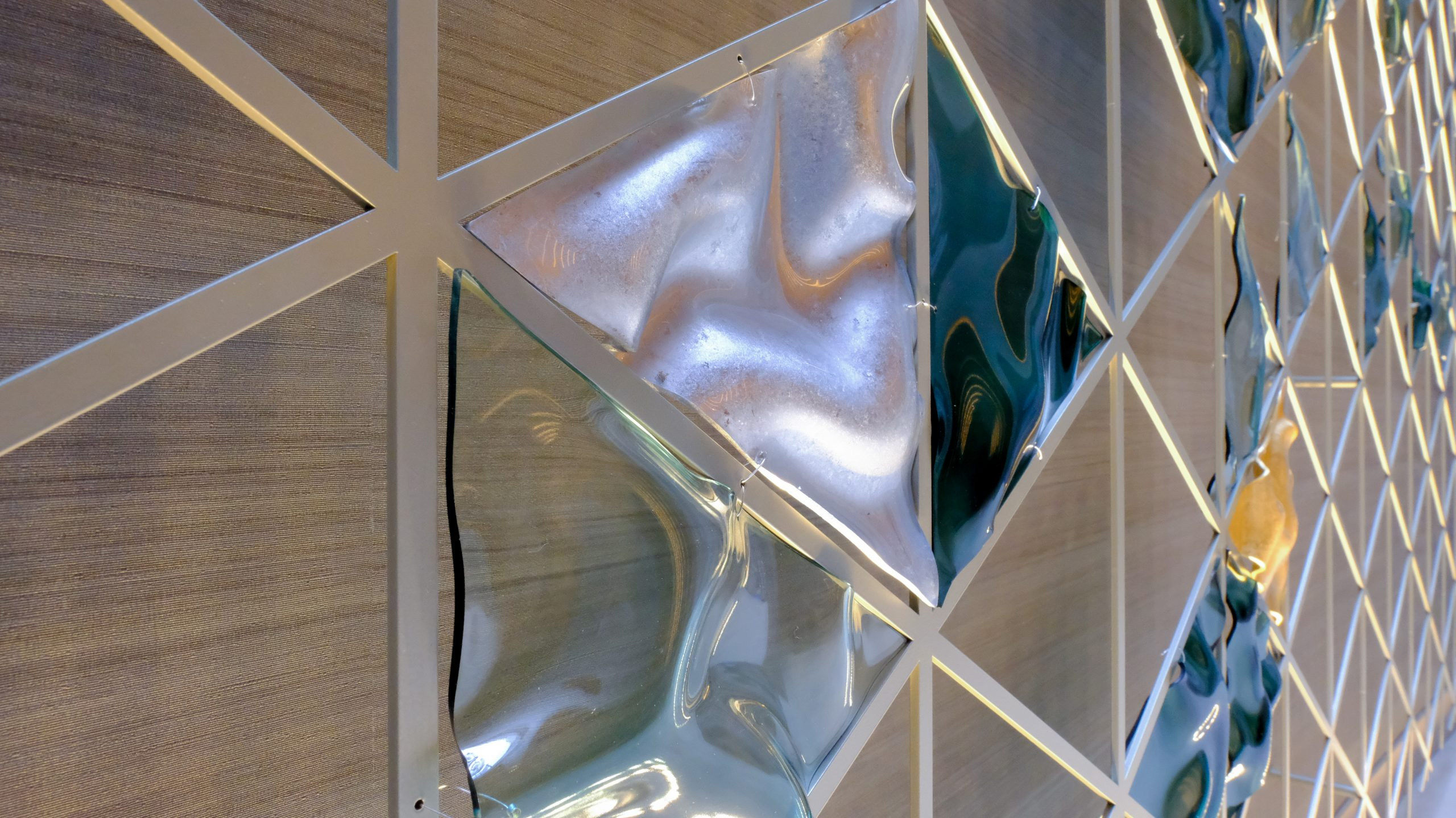 広島を象徴する川である太田川水系の上流部に潜む峡谷・三段峡の情景から啓示を得たデザイン。Demoldは美しい見え方を実現するためにパネルの重ね方も構想を練るなど、多くの提案を行った。