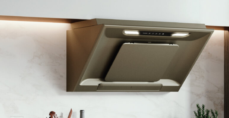 An upgraded fusion cooker hood with Super Kirei oil repellent coating on the fan in an ergonomic inclined design, keeping the hood clean from inside out.