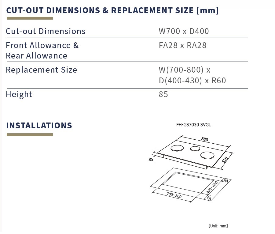 CUT-OUT DIMENSIONS & REPLACEMENT SIZE [mm] |