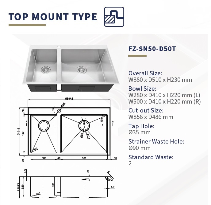 Using 1.2mm-thick material, the durable sinks have deeper depth, allowing you to fit bigger pots and pans in the sink bowl, reducing water splashing to a minimum.