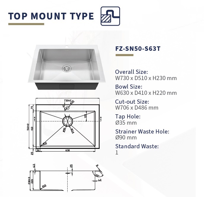 Using 1.2mm-thick material, the durable sinks have deeper depth, allowing you to fit bigger pots and pans in the sink bowl, reducing water splashing to a minimum.