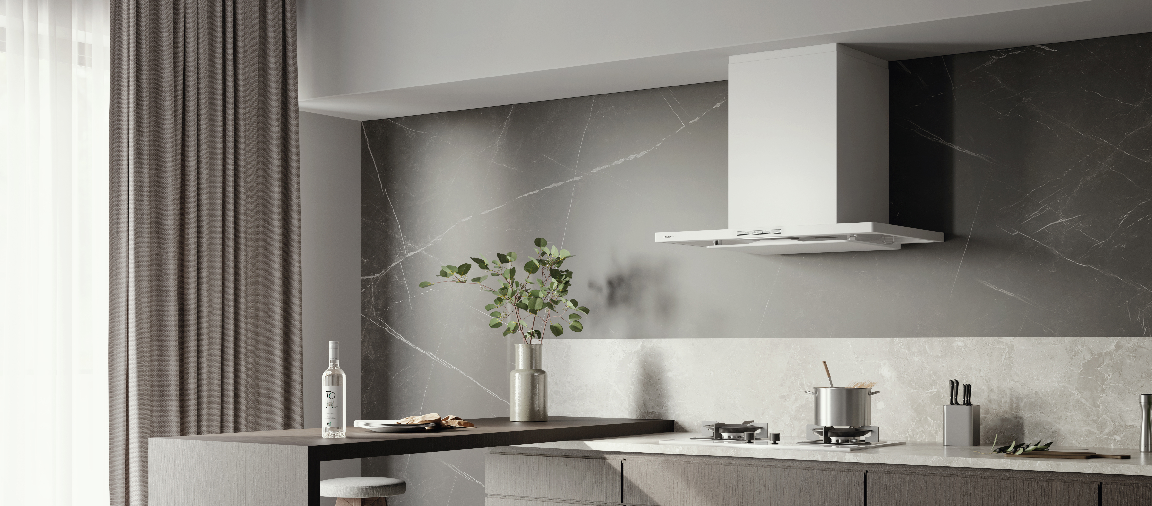 An upgraded fusion cooker hood with Super Kirei oil repellent coating on the fan in an ergonomic inclined design, keeping the hood clean from inside out.