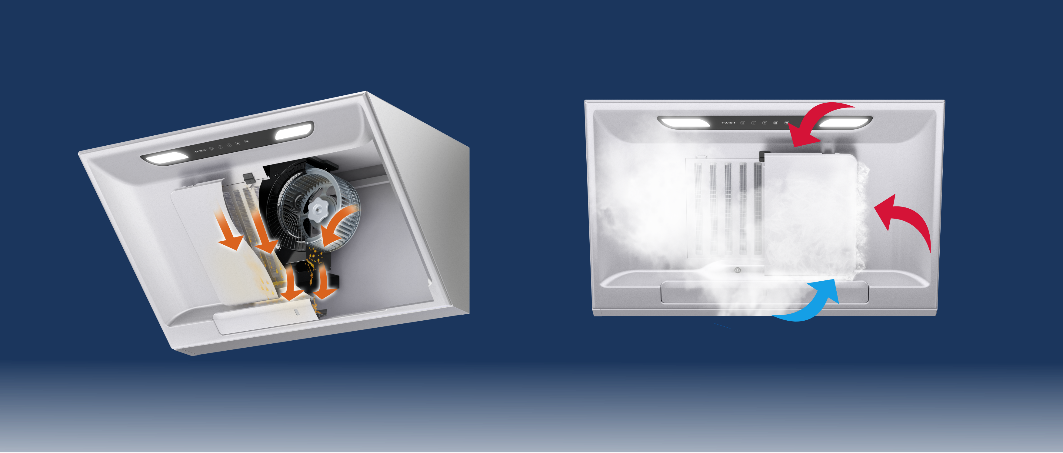 Introducing FUJIOH patented Oil Smasher technology which uses high-speed spinning disk that captures most of the oil in the oil fumes and spins it off into the oil tray.
