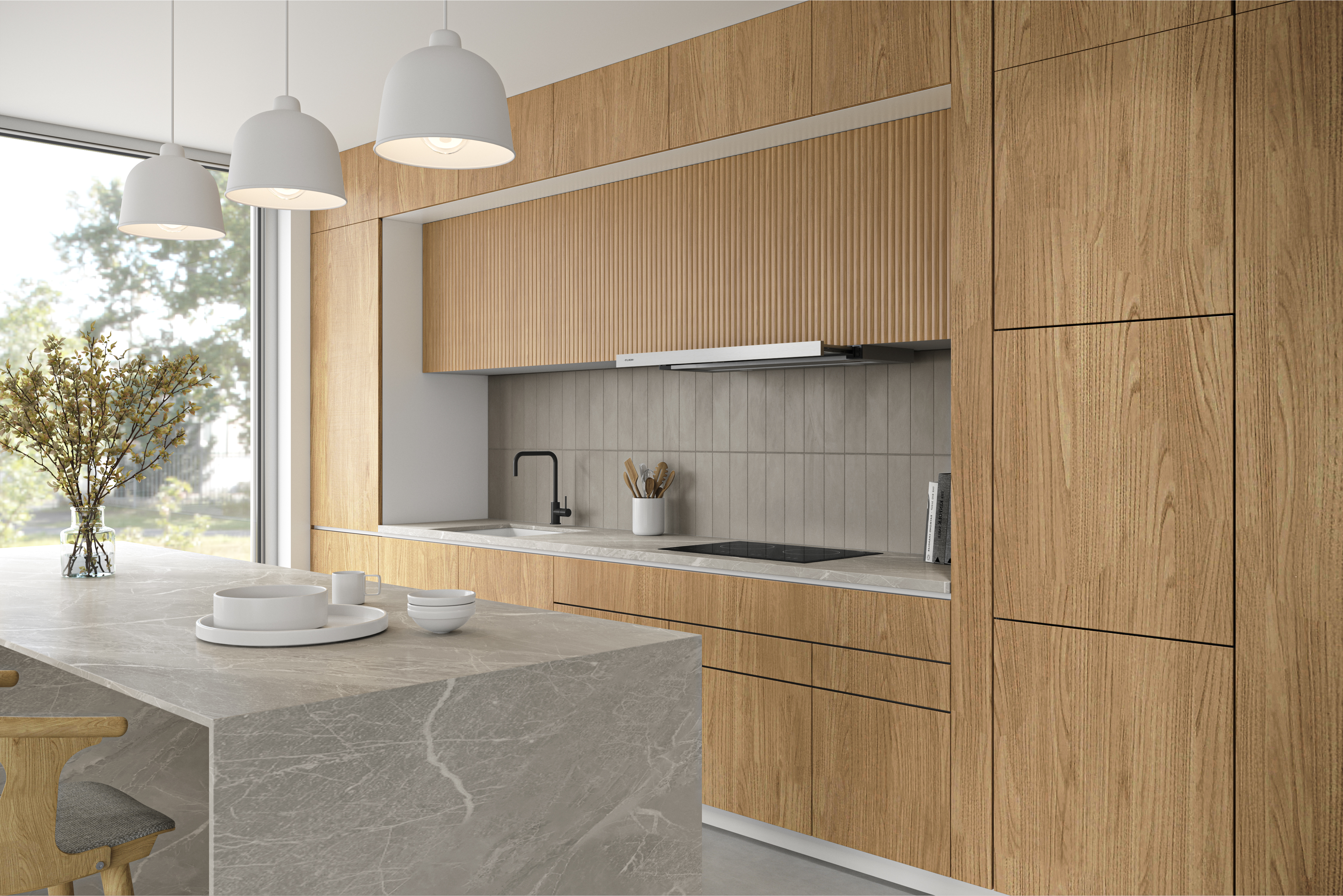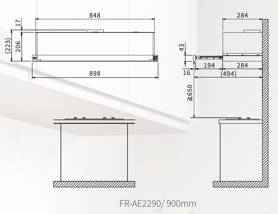 Slim telescopic hood with sliding front panel for minimalist looking kitchen