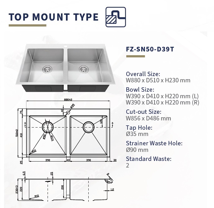 Using 1.2mm-thick material, the durable sinks have deeper depth, allowing you to fit bigger pots and pans in the sink bowl, reducing water splashing to a minimum.