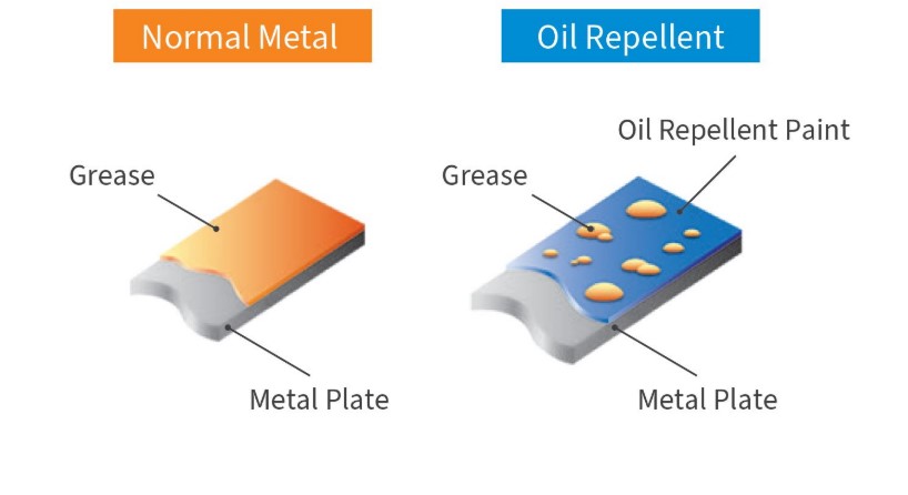 An example would be the Super Kirei Coating in the FUJIOH FR-SC2090 cooker hood, where it repels oil to allow minimal oil to stick to its metal surface. This reduces the accumulation of oil and stain buildup on the fan, prolonging its life span along with making it easier to clean and maintain. Watch this video and understand how Super Kirei Coating works on FUJIOH cooker hood.