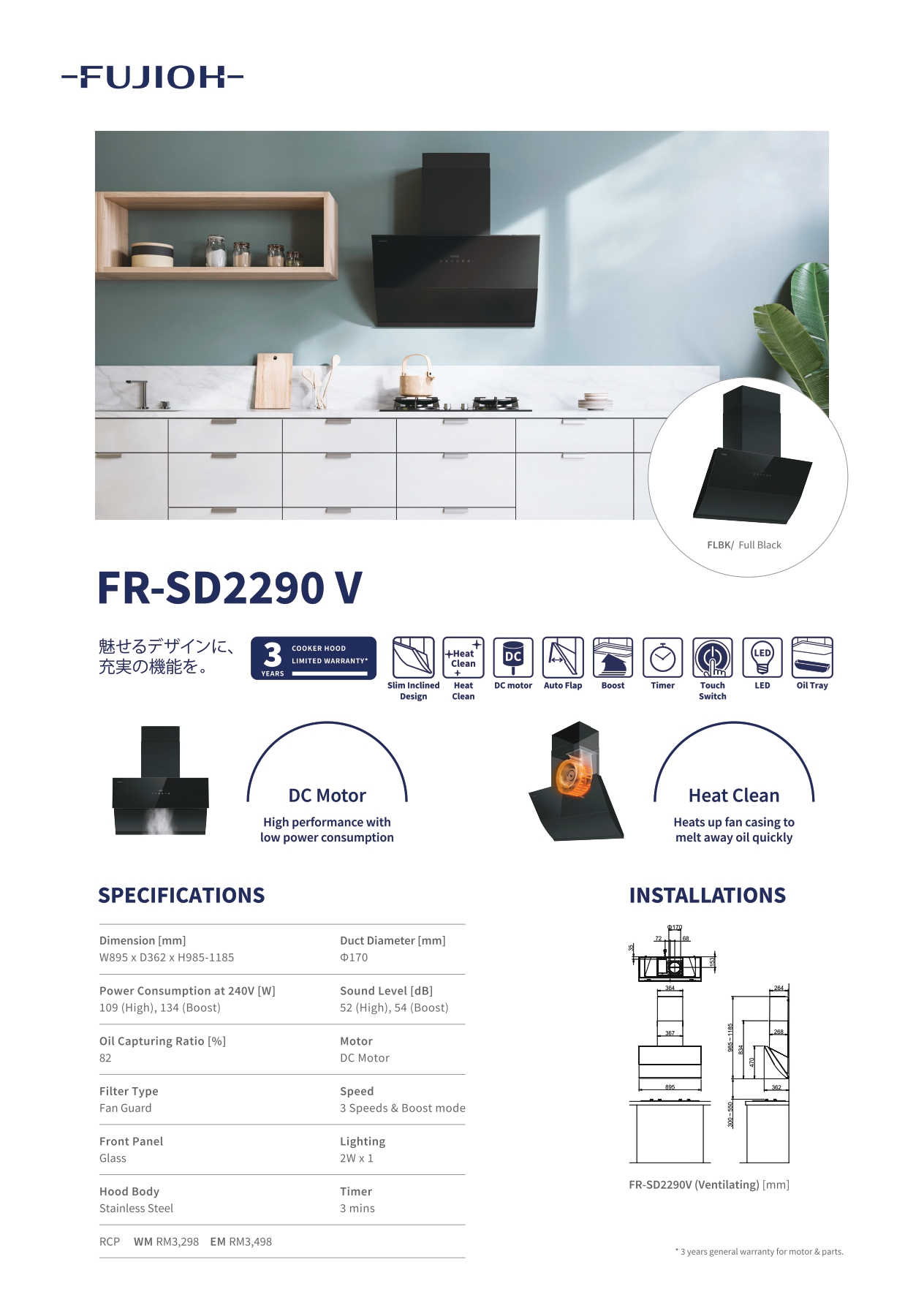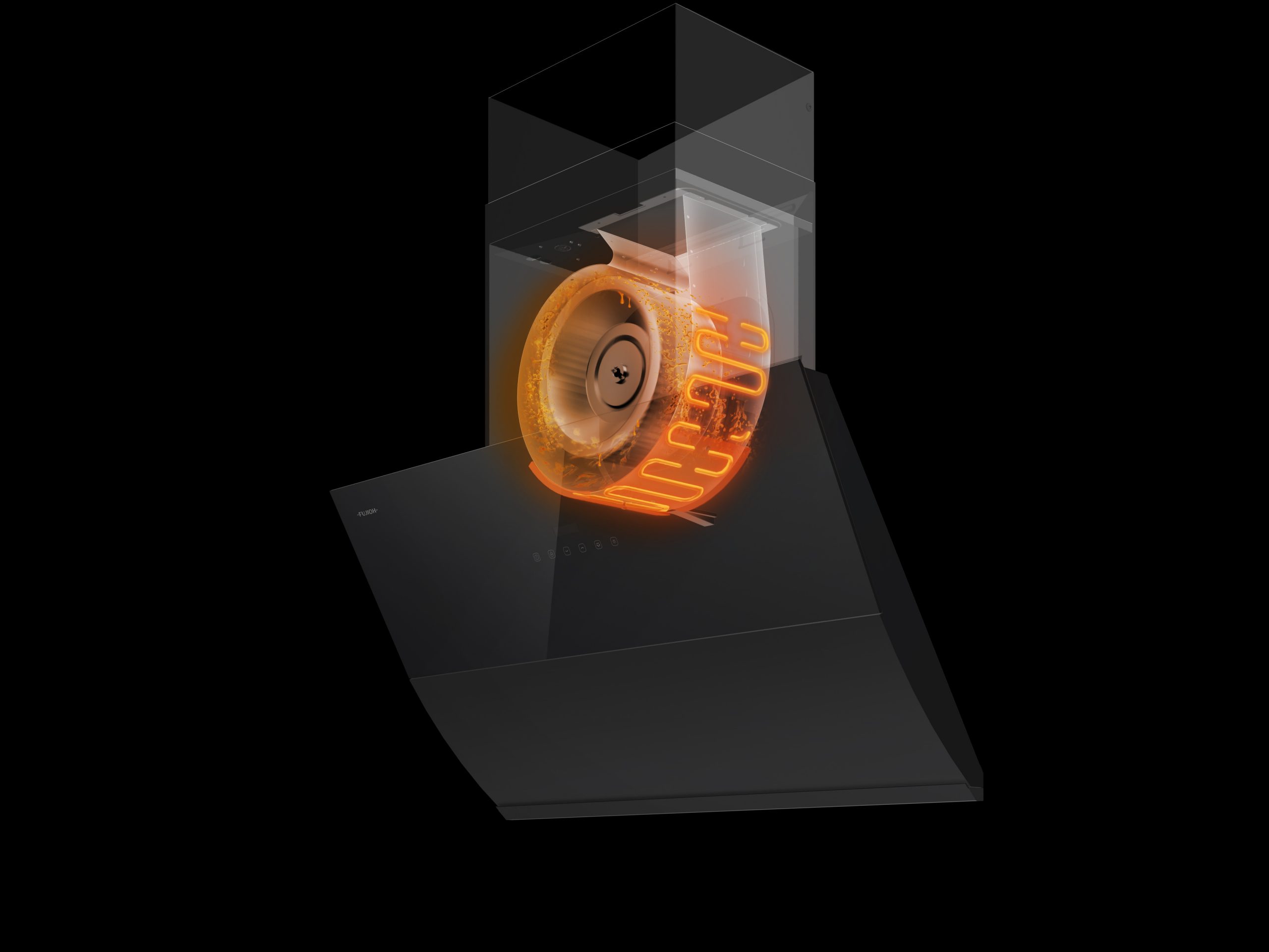 Efficiency is at the core of this FR-SD2290 inclined cooker hood, it comes with Heat Clean operation that eases the maintenance of a clean fan. Achieve high performance with high static pressure, high air flow, low power consumption, and low sound level.