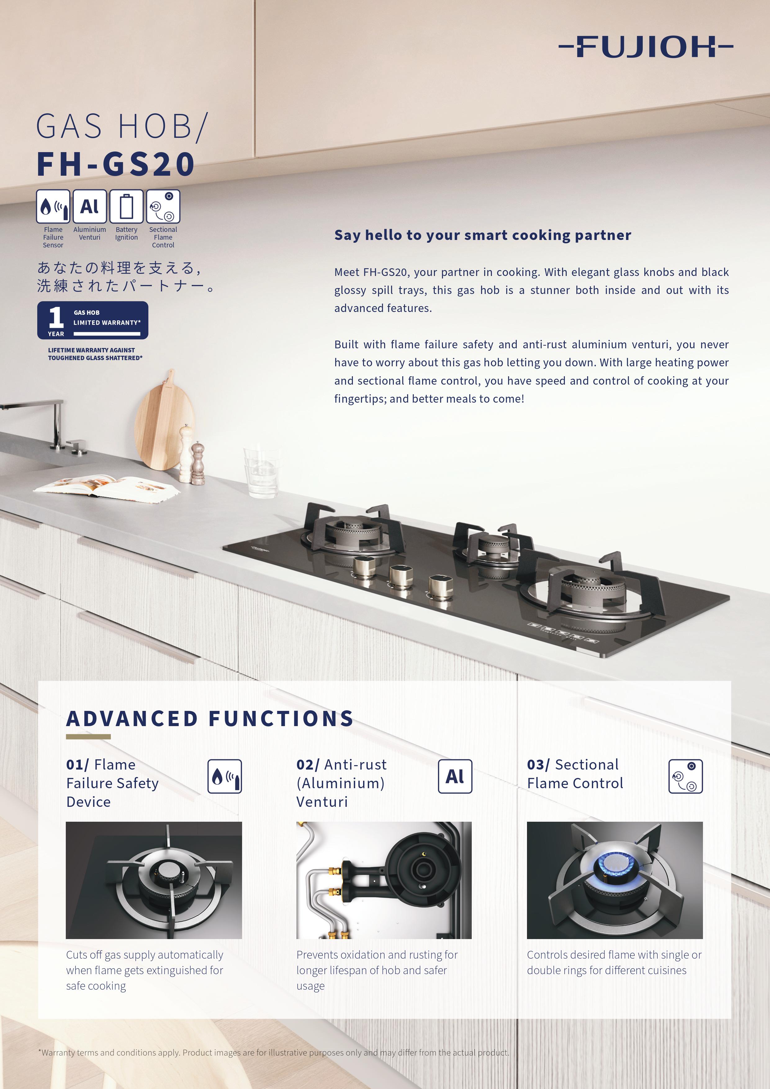Meet FUJIOH FH-GS2030 SVGL gas hob, your partner in cooking. With elegant glass knobs and black glossy spill trays, this gas hob is a stunner both inside and out with its advanced features.