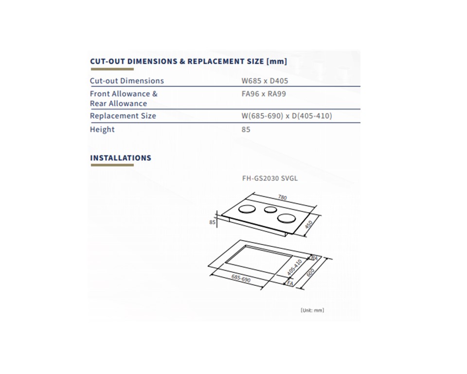 CUT-OUT DIMENSIONS & REPLACEMENT SIZE [mm] |