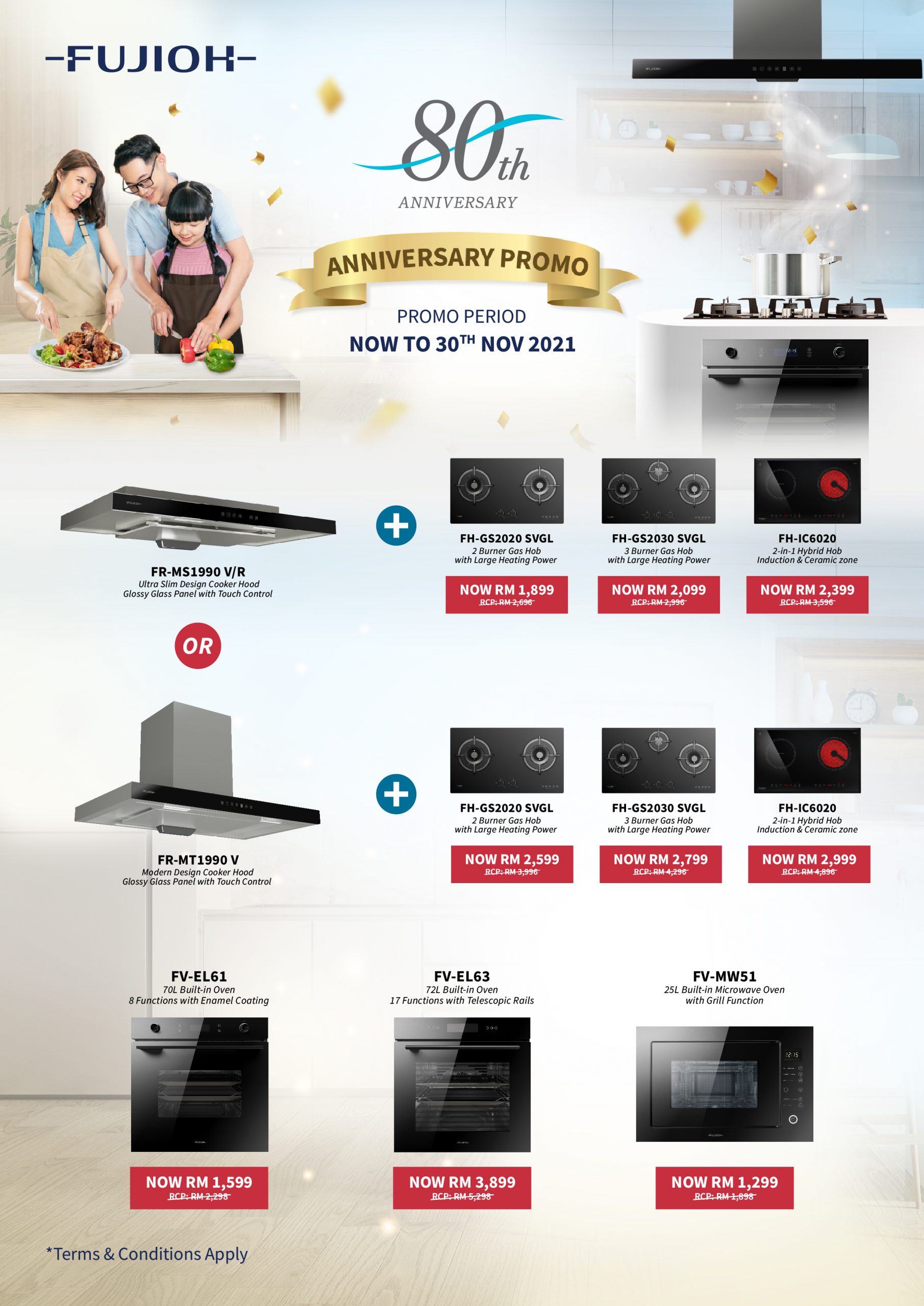 Let’s celebrate FUJIOH 80th Year Anniversary with incredible offers! Get your kitchen a brand-new hood & hob set, microwave oven and oven at a special price today.