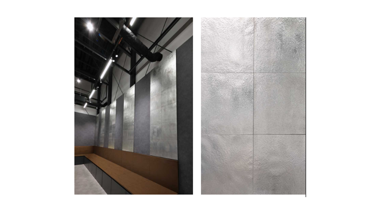 今回制作したパネルは、GXスチール「NSCarbolex® Neutral」を採用したブリキを自在成形技術で加工し、砂の柄を表現した「IZUNA」です。細かな凹凸を加えると素材本来の光沢は失われやすくなりますが、ブリキが持つ「輝度」「軽さ」「加工性」を活かし、金属加工に熟練したDemoldの職人が絶妙な加減で仕上げることで質感と光沢の両立を実現しました。さらに、クリア塗料を塗布することで素材の美しさをいっそう際立たせ、耐久性も向上しています。