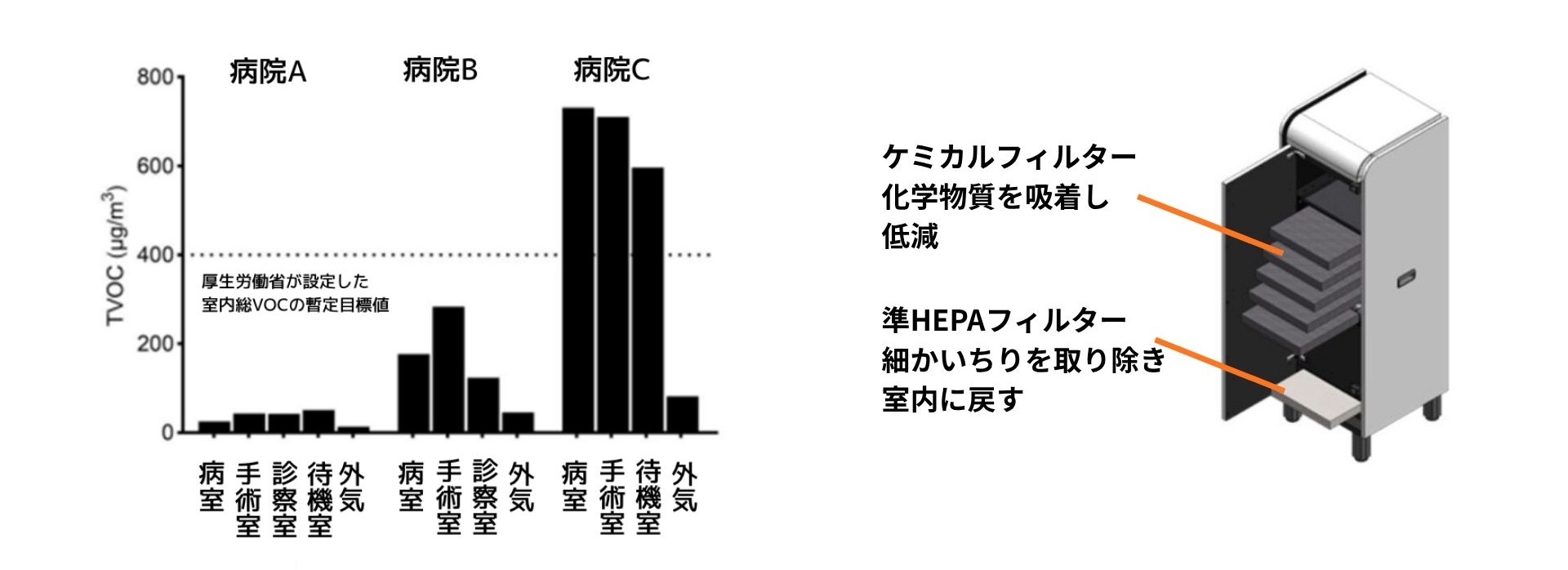 左:VOC低減型空気清浄機稼働・未稼働時の室内の総VOC