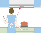 ■加熱機器(ガス/IH)のON⇔OFFと連動して、レンジフードのスイッチが自動的に運転⇔停止(加熱機器限定)。