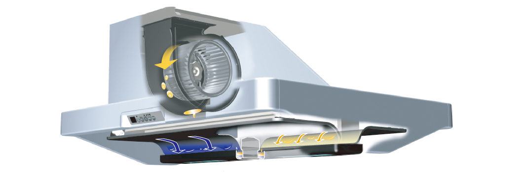 ■キッチン・リビング両サイドから油煙を吸い込むダブル吸い込みは、広い空間でも威力を発揮します。