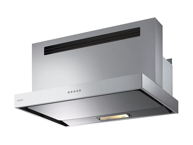 ■フード部分の厚み85㎜の薄型デザイン、機能性も重要視した強制給気タイプ同時給排型レンジフード。