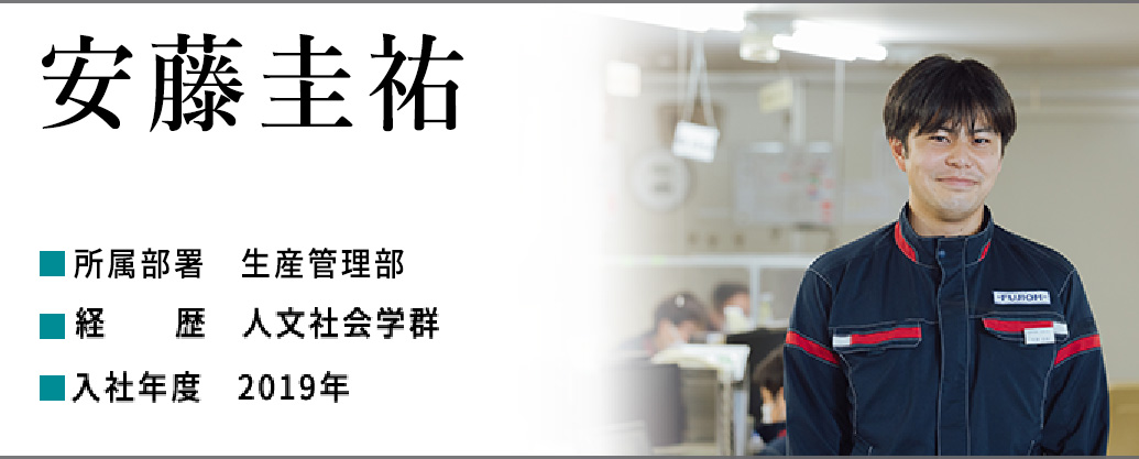 富士工業では、入社して1年間生産研修を行います。他の会社と比べてもこの研修期間は珍しいと思います。後半の半年間は、仮配属で1つの工程をもちます。営業になってから、生産の方と関われたことやこのときの生産研修の経験は大事だったなと感じます。