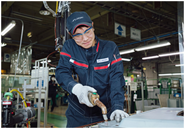業務内容は板金作業です。プレスやNC工程からの部品を溶接しレンジフードなどの部品を作っています。