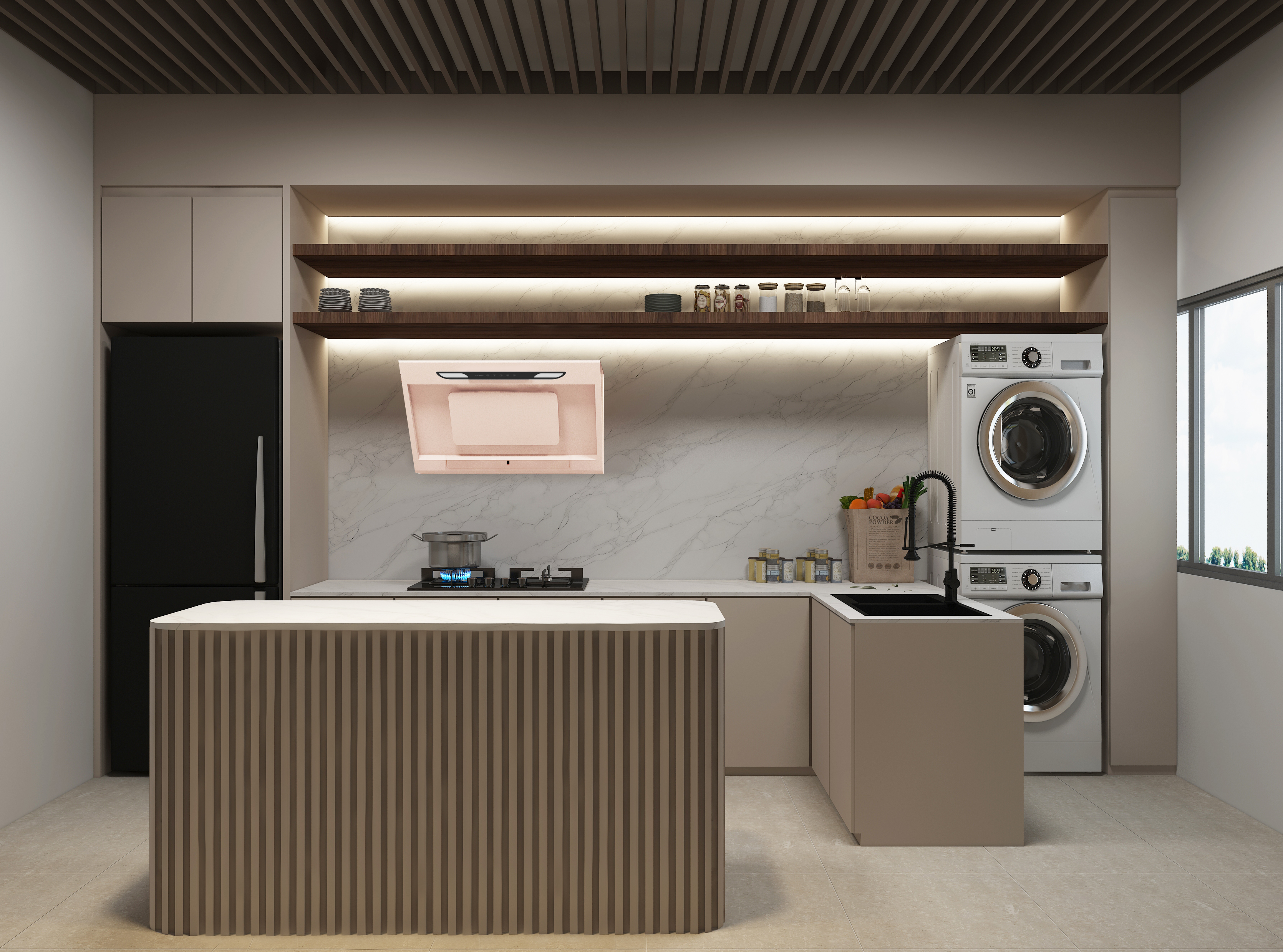 4. Minimalist Modern Zen: In the minimalist modern zen design, the FR-SC2290 Inclined Hood blends seamlessly with a neutral palette highlighted by sleek, modern furnishings. The pink cooker hood introduces a subtle contrast that’s both stylish and understated, emphasizing a clutter-free environment that’s perfect for a zen-like cooking experience.