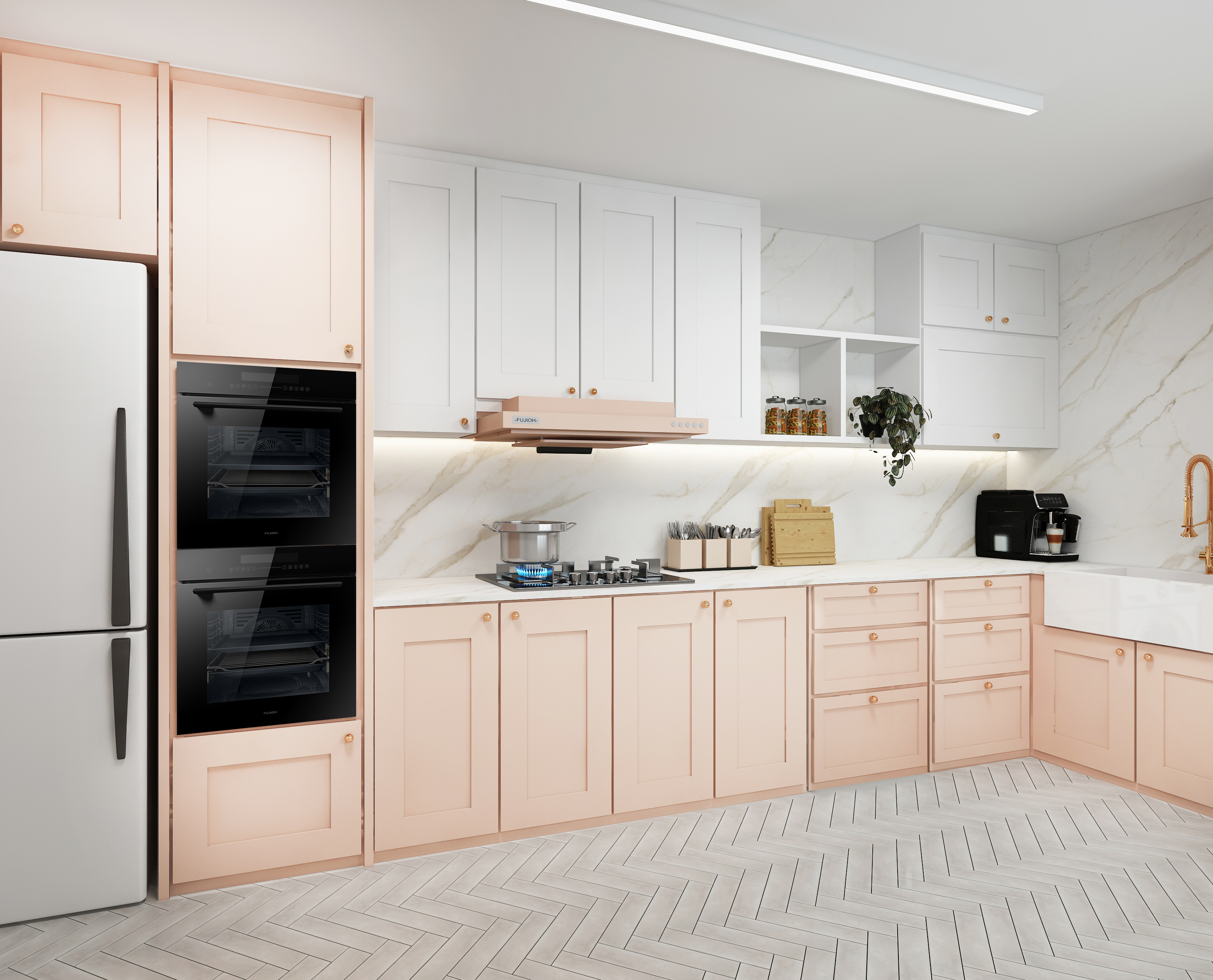 Inspired by these diverse kitchen styles? Each kitchen style showcases the elegance and functionality of FUJIOH’s Sakura Bloom Pink Hood Series featuring the FR-CL1890 Chimney Hood, FR-FS2290 Slim Hood and the FR-SC2090 Inclined Hood.