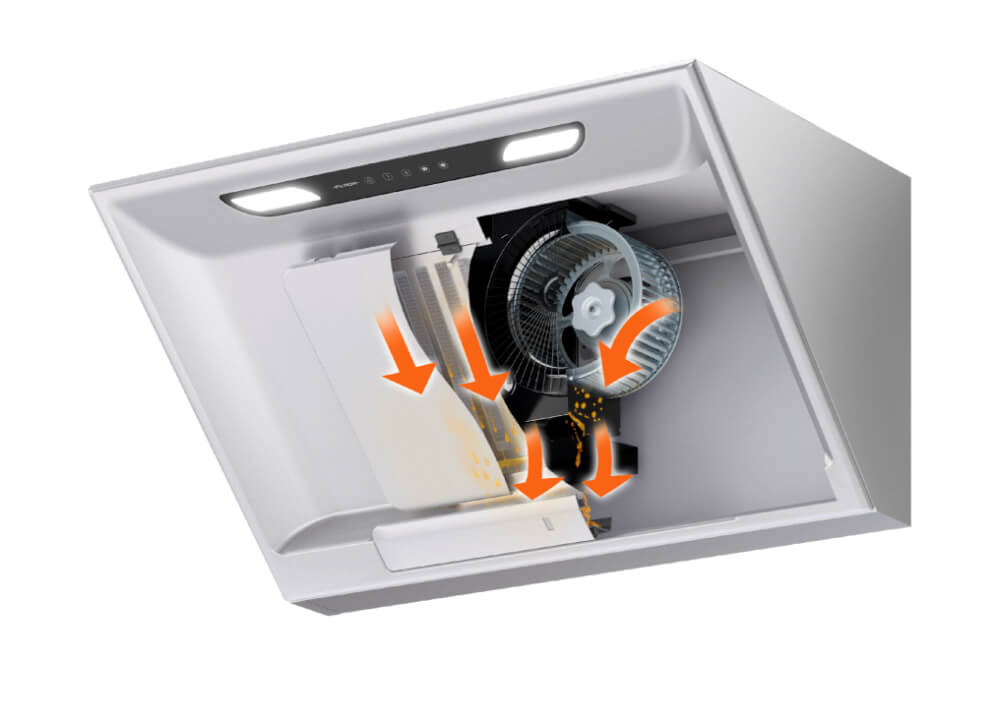 As the cooking fumes are captured, the oil separation process integrated in our FUJIOH technology filtrates captured fumes into oil through rectifier panel, filter and fan. Oil is then captured in the oil tray, reducing oil accumulation in the inner body of the cooker hood and keeping the cooker hood running in optimum condition for a longer time.