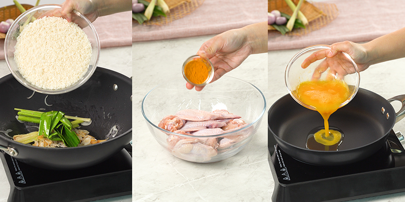 1. Season the chicken wings with salt, turmeric powder, and pepper. Mix well and marinate for an hour. *You may use this time to prepare the omelette.