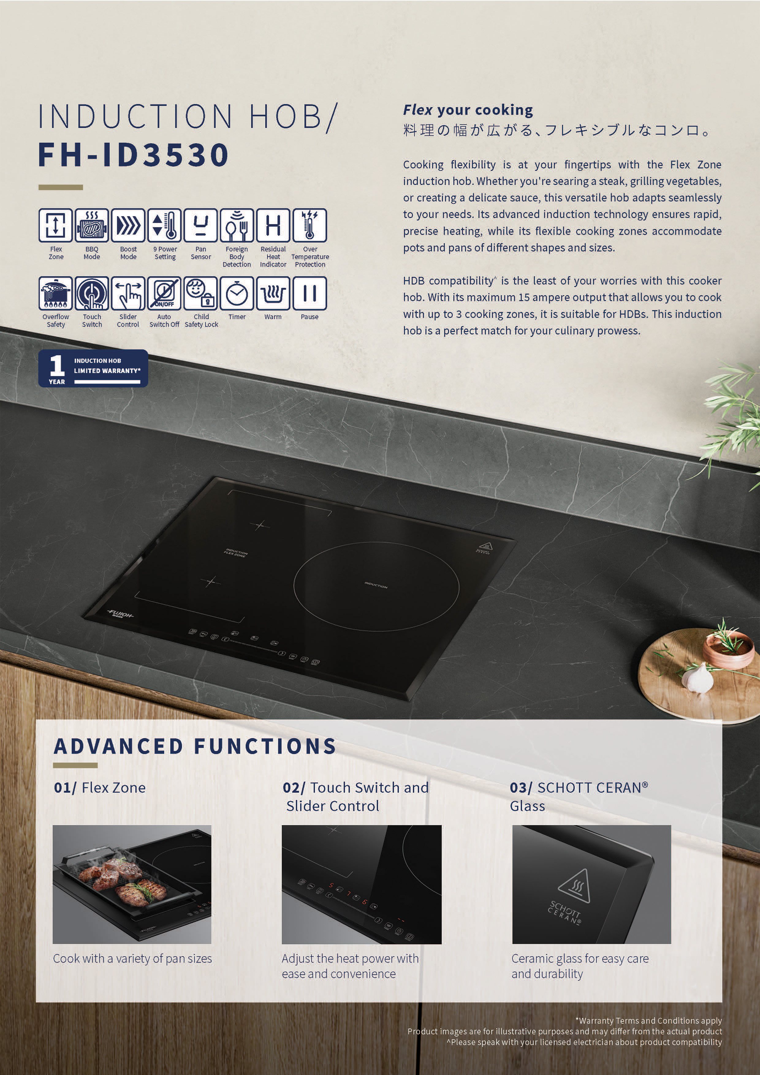 HDB compatibility* is the least of your worries with this cooker hob. With its maximum 15 ampere output that allows you to cook with up to 3 cooking zones, it is suitable for HDBs*. This induction hob is a perfect match for your culinary prowess.