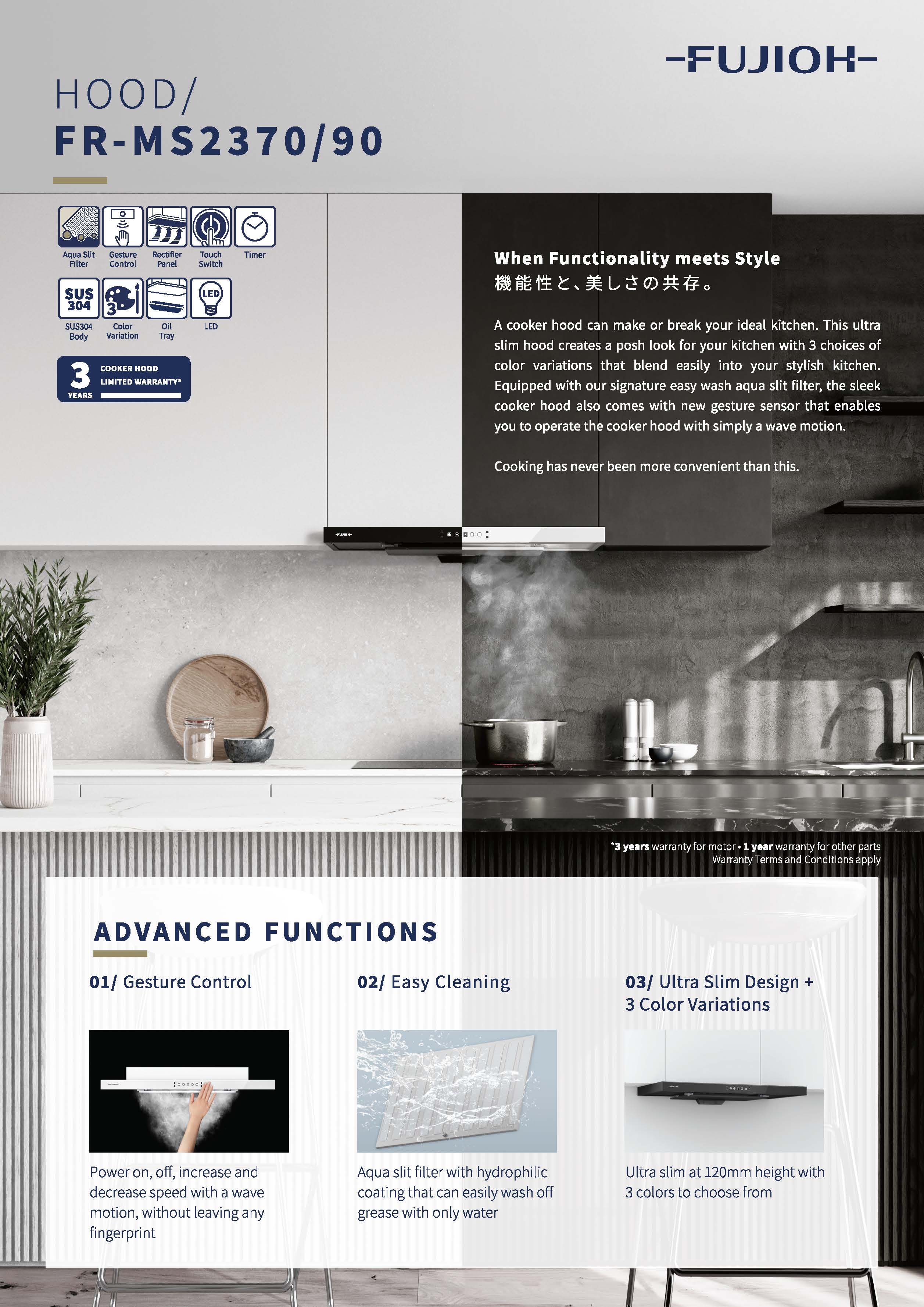 A cooker hood can make or break your ideal kitchen. This ultra slim hood creates a posh look for your kitchen with 3 choices of colour variations that blend easily into your stylish kitchen. Equipped with our signature easy to wash Aqua Slit Filter, the sleek cooker hood also comes with new gesture sensor that enables you to operate the cooker hood with simply a wave motion.