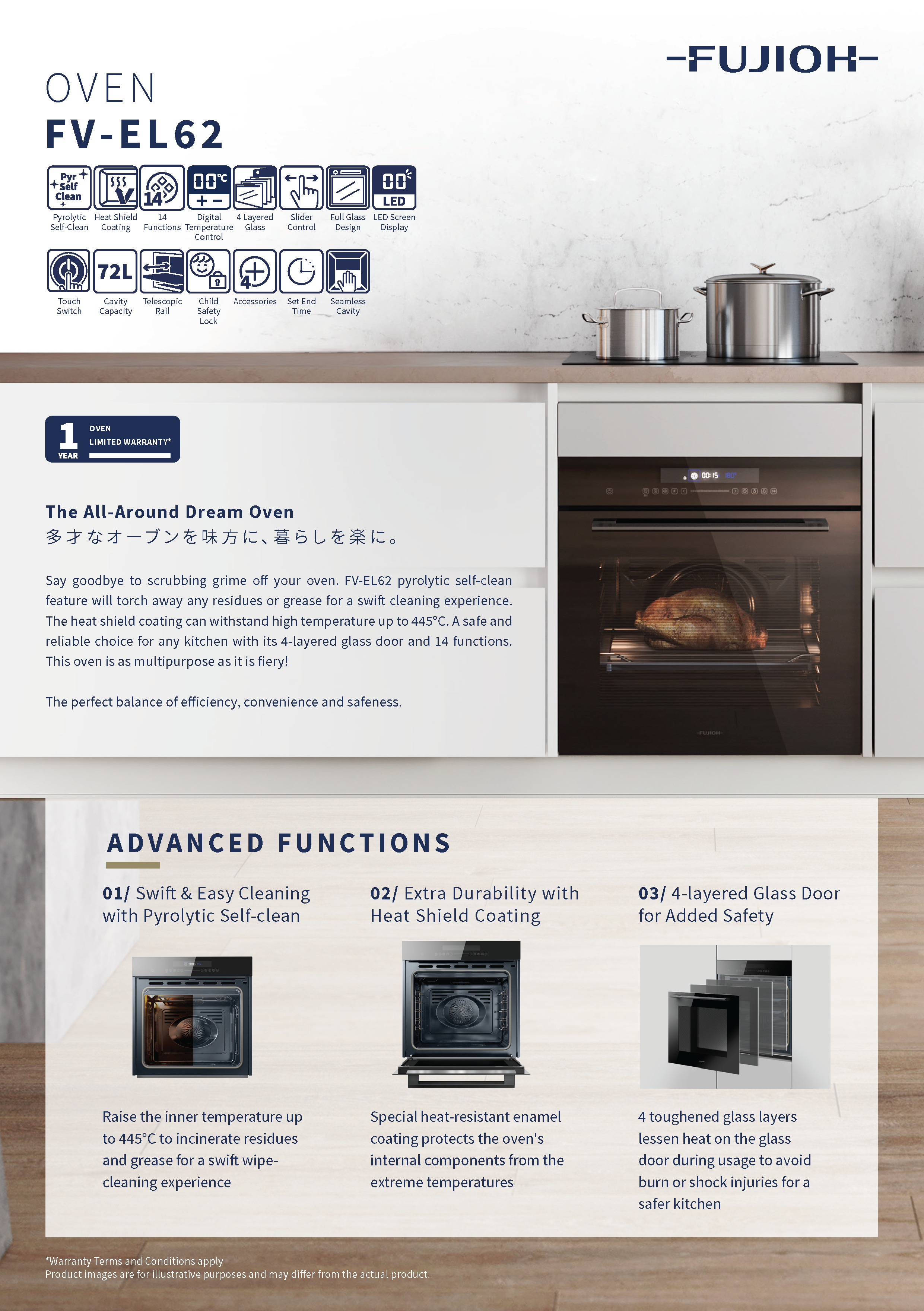 Say goodbye to scrubbing grime off your oven. FV-EL62 Pyrolytic Self-Clean feature will torch away any residues or grease for a swift cleaning experience. The Heat Shield Coating can withstand high temperature up to 445°C. A safe and reliable choice for any kitchen with its 4-Layered Glass Door and 14 Functions. This oven is as multipurpose as it is fiery!